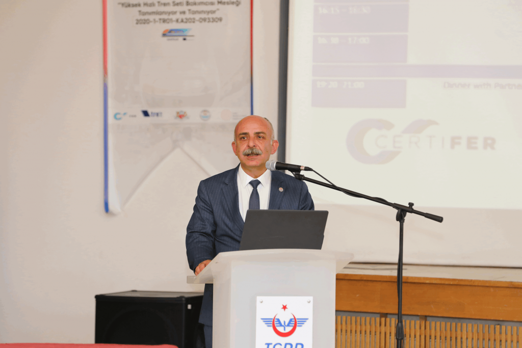 Projenin Koordinatör Kuruluşu adına konuşma yapan TCDD Taşımacılık A.Ş. Genel Müdür Yardımcısı Erol Arıkan, projenin sağlıklı bir şekilde bitmesinden duyduğu memnuniyeti dile getirerek söze başladı. TCDD ve TCDD Taşımacılık A.Ş. olarak geçmişten gelen Avrupa Birliği projelerinde tecrübeyi bu projeye de yansıttıklarını, projenin zamanında, bütçesinde ve istenen kapsamda bitirmenin çok değerli olduğunu belirtti. Raylı sistemler sektöründe çalışan araçların bakımcıların kalifikasyonun arttırılması için hazırlanmış projede çok önemli çıktıların elde edildiğini belirtti. Özellikle bu mesleklerin zorunlu meslek haline gelmesinin projenin ne derece kritik bir hale geldiğinin göstergesi olduğunu belirtti. Proje kapsamında çalışan tüm ortaklara ve tüm ortakların uzmanlarına teşekkürlerini ileterek konuşmasını tamamladı.